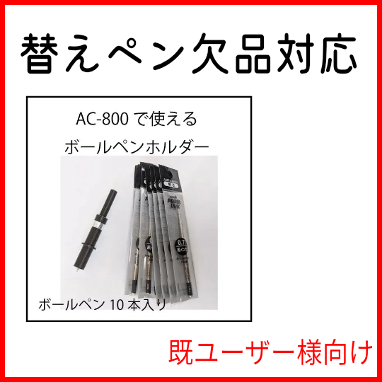 弊社で新たに用意した"AC-800で使えるボールペンホルダー[Bタイプ]"を、旧来の[Aタイプ]用替芯の欠品期間中、お貸し出いたします。大変恐縮ですが、事務手数費と[Bタイプ]用の替芯費用はご負担ください。替芯が10本で足りないお客様は、追加で